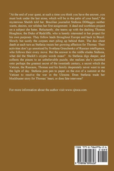 "At the end of your quest, at such a time you think you have the answer, you must look under the last stone, which will be in the palm of your hand," the mysterious Sheikh told her. Brazilian journalist Stefania DiMaggio neither wants, desires, nor relishes her first assignment. A dead end worthless project on a subject she hates. Reluctantly, she teams up with the dashing Thomas Houghton, the Duke of Radcliffe, who is keenly interested in her project for his own purposes. They follow leads throughout Europe and back to Brazil. Slowly but surely the corpses start piling up behind them. The duo cheat death at each turn as Stefania resists her growing affection for Thomas. Their activities don't go unnoticed by Svetlana Greschenko of Russian intelligence, who follows their every move. But the answer to the riddle eludes Stefania, what did the Sheikh's cryptic words mean? As Stefania digs deeper, and collects the pieces to an unbelievable puzzle, she realizes she's stumbled onto perhaps the greatest secret of the twentieth century, a secret which the Vatican, the Russians, Thomas and his family desperately never want to see the light of day. Stefania puts pen to paper on the eve of a summit at the Vatican to resolve the war in the Ukraine. Does Stefania trade her blockbuster story for Thomas' heart, or does fate intervene? For more information about the author visit www.cjtoca.com.