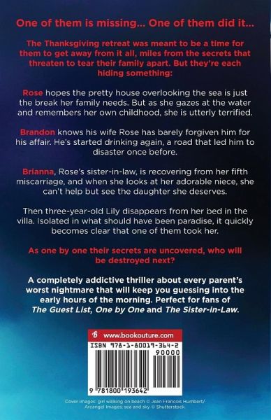 One of them is missing... One of them did it... The Thanksgiving retreat was meant to be a time for them to get away from it all, miles from the secrets that threaten to tear their family apart. But they're each hiding something: Rose hopes the pretty house overlooking the sea is just the break her family needs. But as she gazes at the water and remembers her own childhood, she is utterly terrified. Brandon knows his wife Rose has barely forgiven him for his affair. He's started drinking again, a road that led him to disaster once before. Brianna, Rose's sister-in-law, is recovering from her fifth miscarriage, and when she looks at her adorable niece, she can't help but see the daughter she deserves. Then three-year-old Lily disappears from her bed in the villa. Isolated in what should have been paradise, it quickly becomes clear that one of them took her. As one by one their secrets are uncovered, who will be destroyed next? A completely addictive thriller about every parent's worst nightmare that will keep you guessing into the early hours of the morning. Perfect for fans of The Guest List, One by One and The Sister-in-Law. What readers are saying about The Vacation: "OMG... the story grips from the start. Nail-biting and heartbreaking. Eek-I'll be thinking about the ending for a long time. It had everything that a brilliant mystery needs and I'd recommend it in a heartbeat!" Bestselling author, Carla Kovach ¿¿¿¿¿ "I probably shouldn't have read it after bedtime, but I had to find out what happened to Lily. This is a compulsive read with plenty of twists and a family full of suspects." Goodreads reviewer