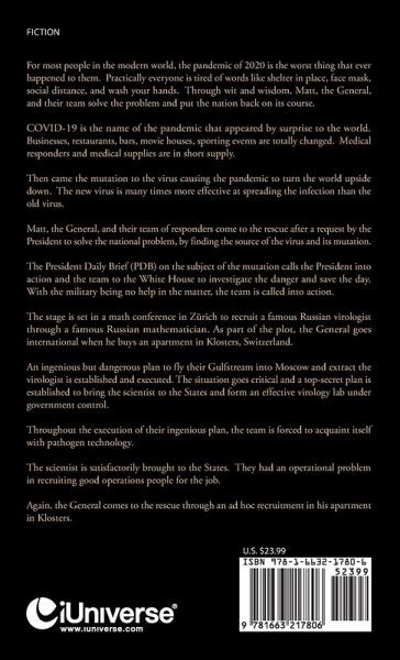 For most people in the modern world, the pandemic of 2020 is the worst thing that ever happened to them. Practically everyone is tired of words like shelter in place, face mask, social distance, and wash your hands. Through wit and wisdom, Matt, the General, and their team solve the problem and put the nation back on its course. COVID-19 is the name of the pandemic that appeared by surprise to the world. Businesses, restaurants, bars, movie houses, sporting events are totally changed. Medical responders and medical supplies are in short supply. Then came the mutation to the virus causing the pandemic to turn the world upside down. The new virus is many times more effective at spreading the infection than the old virus. Matt, the General, and their team of responders come to the rescue after a request by the President to solve the national problem, by finding the source of the virus and its mutation. The President Daily Brief (PDB) on the subject of the mutation calls the President into action and the team to the White House to investigate the danger and save the day. With the military being no help in the matter, the team is called into action. The stage is set in a math conference in Zürich to recruit a famous Russian virologist through a famous Russian mathematician. As part of the plot, the General goes international when he buys an apartment in Klosters, Switzerland. An ingenious but dangerous plan to fly their Gulfstream into Moscow and extract the virologist is established and executed. The situation goes critical and a top-secret plan is established to bring the scientist to the States and form an effective virology lab under government control. Throughout the execution of their ingenious plan, the team is forced to acquaint itself with pathogen technology. The scientist is satisfactorily brought to the States. They had an operational problem in recruiting good operations people for the job. Again, the General comes to the rescue through an ad hoc recruitment in his apartment in Klosters.