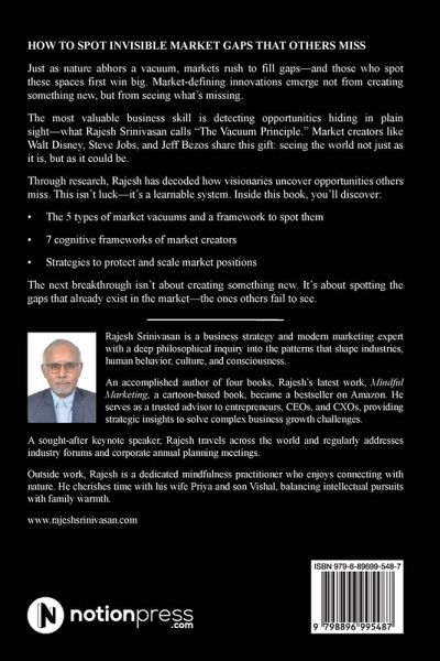 Just as nature abhors a vacuum, markets rush to fill gaps-and those who spot these spaces first win big. Market-defining innovations emerge not from creating something new, but from seeing what's missing. The most valuable business skill is detecting opportunities hiding in plain sight-what Rajesh Srinivasan calls "The Vacuum Principle." Market creators like Walt Disney, Steve Jobs, and Jeff Bezos share this gift: seeing the world not just as it is, but as it could be. Through research, Rajesh has decoded how visionaries uncover opportunities others miss. This isn't luck-it's a learnable system. Inside this book, you'll discover: - The 5 types of market vacuums and a framework to spot them - 7 cognitive frameworks of market creators - Strategies to protect and scale market positions The next breakthrough isn't about creating something new. It's about spotting the gaps that already exist in the market-the ones others fail to see.