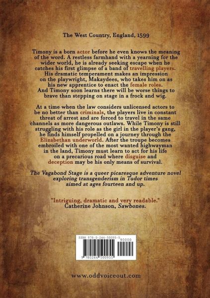 The West Country, England, 1599 Timony is a born actor before he even knows the meaning of the word. A restless farmhand with a yearning for the wider world, he is already seeking escape when he catches his first glimpse of a band of travelling players. His dramatic temperament makes an impression on the playwright, Makaydees, who takes him on as his new apprentice to enact the female roles. And Timony soon learns there will be worse things to brave than stepping on stage in a frock and wig. The Vagabond Stage is a queer picaresque adventure novel exploring transgenderism in Tudor times aimed at ages fourteen and up.