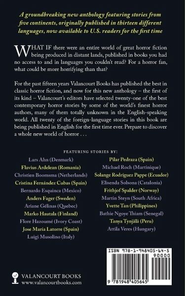 Shirley Jackson Award Nominee ¿ Longlisted for the Bram Stoker Award What if there were a whole world of great horror fiction out there you didn't know anything about, written by authors in distant lands and in foreign languages, outstanding horror stories you had no access to, written in languages you couldn't read? For an avid horror fan, what could be more horrifying than that? For this groundbreaking volume, the first of its kind, the editors of Valancourt Books have scoured the world, reading horror stories from dozens of countries in nearly twenty languages, to find some of the best contemporary international horror stories. The stories in this volume come from 19 countries on 5 continents and were originally written in 13 different languages. All 20 foreign language stories in this volume are appearing in English for the first time ever. The book includes stories by some of the world's preeminent horror authors, many of them not yet known in the English-speaking world.
