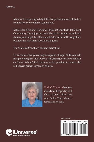 Music is the surprising catalyst that brings love and new life to two women from very different generations. Millie is the director of Christmas House at Sunny Hills Retirement Community. She enjoys her busy life and her friends-until Jack shows up one night. For fifty years she's forced herself to forget him, but now she can't think about anything else. The Valentine Symphony changes everything. "Love comes when you're busy doing other things," Millie counsels her granddaughter Vicki, who is still grieving over her unfaithful ex-fiancé. When Vicki rediscovers her passion for music, she rediscovers herself. Love soon follows.