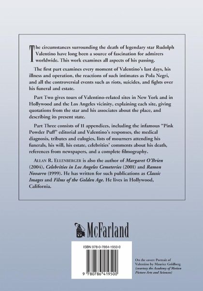 The circumstances surrounding the death of legendary star Rudolph Valentino have been a constant source of fascination for admirers worldwide. This work examines every aspect of his passing, analyzing the circumstances and gathering information into one convenient source for the Valentino scholar and enthusiast. The first part examines every moment of the last days of Rudolph Valentino, his illness and operation, the reactions of such intimates as Pola Negri, and all controversy such as riots, suicides, and fights over his funeral and estate. Part two gives tours of Valentino-related sites in New York, Hollywood and West Hollywood, downtown and suburban Los Angeles, and Beverly Hills, explaining each site's part in Valentino's history, giving quotes from the star and his associates about the place, and describing its present state. Part three consists of eleven appendices giving such information as the infamous ""Pink Powder Puff"" editorial and Valentino's responses, the medical diagnosis, operation on and treatment of the idol, tributes and eulogies, the list of mourners attending his funerals, his last will and testament, the summation of his estate, quotes about his death, references from newspapers, and a complete filmography.
