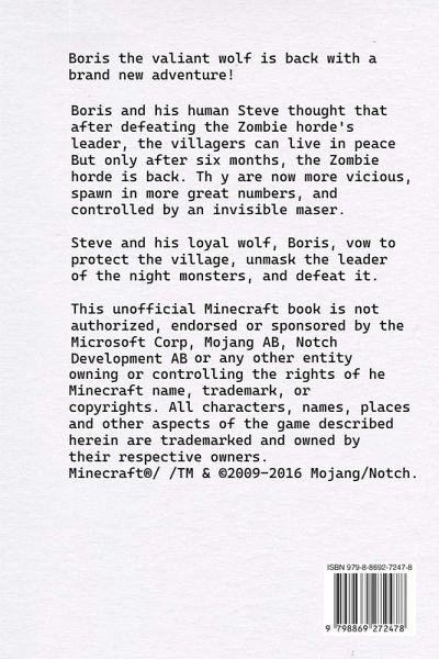 Boris is back with a brand new adventure! Boris and his human Steve thought that after defeating the Zombie horde's leader, the Villagers could live in peace. But only after six months, the Zombie horde is back. They are now more vicious, span in greater numbers, and are controlled by an invisible maser. Steve and his loyal wolf, Boris, vow to protect the village, unmask the leader of the night monsters, and defeat it. This unofficial Minecraft book is not authorized, endorsed or sponsored by Microsoft Corp., Mojang AB, Notch Development AB or any other person or entity owning or controlling the rights of the Minecraft name, trademark or copyrights. All characters, names, places and other aspects of the game described herein are trademarked and owned by their respective owners. Minecraft®/ /TM & (c)2009-2016 Mojang/Notch.