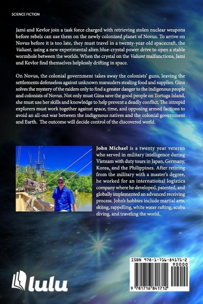 Jami and Kevlor join a task force charged with retrieving stolen nuclear weapons before rebels can use them on the newly colonized planet of Novus. To arrive on Novus before it is too late, they must travel in a twenty-year old spacecraft, the Valiant, using a new experimental alien blue-crystal power drive to open a stable wormhole between the worlds. When the crystal on the Valiant malfunctions, Jami and Kevlor find themselves helplessly drifting in space. On Novus, the colonial government takes away the colonists' guns, leaving the settlements defenseless against unknown marauders stealing food and supplies. Gina solves the mystery of the raiders only to find a greater danger to the indigenous people and colonists of Novus. Not only must Gina save the good people on Tortuga Island, she must use her skills and knowledge to help prevent a deadly conflict. The intrepid explorers must work together against space, time, and opposing armed factions to avoid an all-out war between the indigenous natives and the colonial government and Earth. The outcome will decide control of the discovered world.