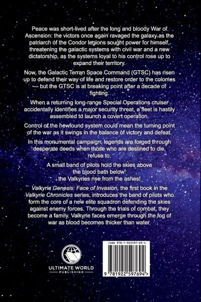 Peace was short-lived after the long and bloody War of Ascension: the victors once again ravaged the galaxy as the patriarch of the Condor legions sought power for himself, threatening the galactic systems with civil war and a new dictatorship, as the systems loyal to his control rose up to expand their territory. Now, the Galactic Terran Space Command (GTSC) has risen up to defend their way of life and restore order to the colonies - but the GTSC is at breaking point after a decade of fighting. When a returning long-range Special Operations cruiser accidentally identifies a major security threat, a fleet is hastily assembled to launch a covert operation. Control of the newfound system could mean the turning point of the war as it swings in the balance of victory and defeat. In this monumental campaign, legends are forged through desperate deeds when those who are destined to die, refuse to. A small band of pilots hold the skies above the blood bath below: the Valkyries rise from the ashes! Valkyrie Genesis: Face of Invasion, the first book in the Valkyrie Chronicles series, introduces the band of pilots who form the core of a new elite squadron defending the skies against enemy forces. Through the trials of combat, they become a family. Valkyrie faces emerge through the fog of war as blood becomes thicker than water.