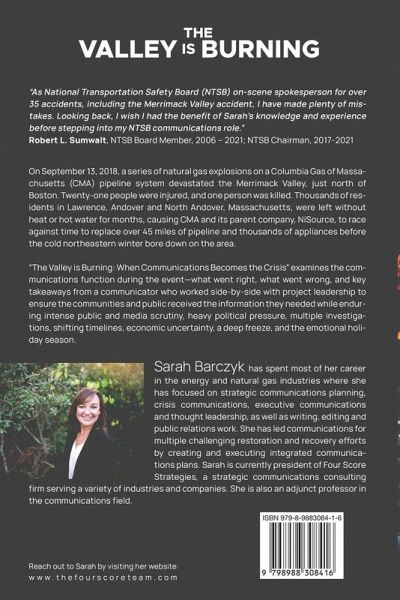 When disaster strikes, will you be prepared for the backlash? On September 13, 2018, a series of natural gas explosions on a Columbia Gas of Massachusetts (CMA) pipeline system devastated the Merrimack Valley, just north of Boston, Massachusetts. Twenty-one people were injured, and one person was killed. Thousands of residents in the towns of Andover and North Andover as well as the city of Lawrence were left without heat or hot water for months for months, causing CMA and its parent company, NiSource, to race against mother nature to replace nearly 45 miles of pipeline and thousands of appliances to affected residents, before the cold northeastern winter bore down on the area. Sarah Barczyk's The Valley is Burning: When Communications Becomes the Crisis examines the communications function during the event-what went right, what went wrong, and key takeaways from a communicator who worked side-by-side with project leadership to ensure the communities and public received the information they needed while enduring intense public and media scrutiny, heavy political pressure and backlash, multiple investigations, shifting timelines, economic uncertainty, a deep freeze, and the emotional holiday season.