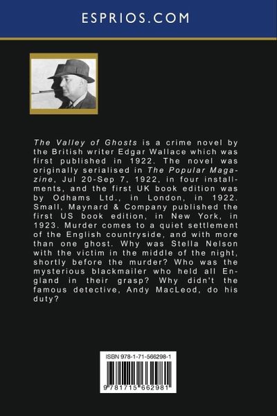 The Valley of Ghosts is a crime novel by the British writer Edgar Wallace which was first published in 1922. The novel was originally serialised in The Popular Magazine, Jul 20-Sep 7, 1922, in four installments, and the first UK book edition was by Odhams Ltd., in London, in 1922. Small, Maynard and Company published the first US book edition, in New York, in 1923. Murder comes to a quiet settlement of the English countryside, and with more than one ghost. Why was Stella Nelson with the victim in the middle of the night, shortly before the murder? Who was the mysterious blackmailer who held all England in their grasp? Why didn't the famous detective, Andy MacLeod, do his duty?