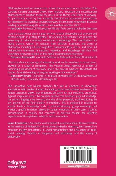 With twelve chapters by leading and up-and-coming academics, this edited collection shows that emotions do count for our epistemic enterprise. Against scepticism about the possible positive role emotions play in knowledge, the authors highlight the how and the why of this potential, lucidly exploring the key aspects of the functionality of emotions. This is explored in relation to: specific kinds of knowledge such as self-understanding, group-knowledge and wisdom; specific functions played by certain emotions in these cases, such as disorientation in enquiry and contempt in practical reason; the affective experience of the epistemic subjectsand communities.
