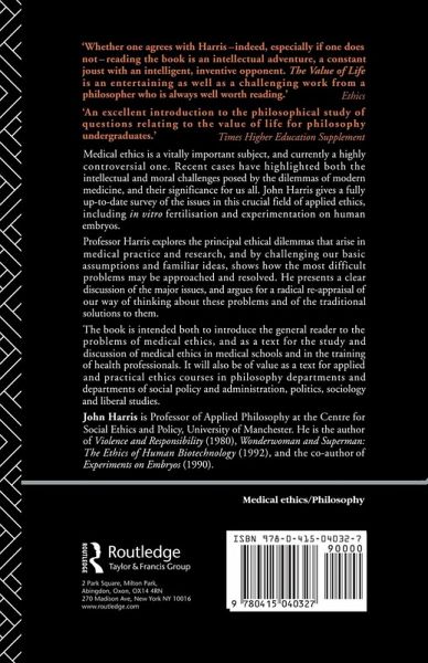 A critical survey of the issues in a controversial field, "The Value of Life" explores the dilemmas in current medical practice and research. Harris argues for a radical reappraisal of our ways of thinking about medical ethics.