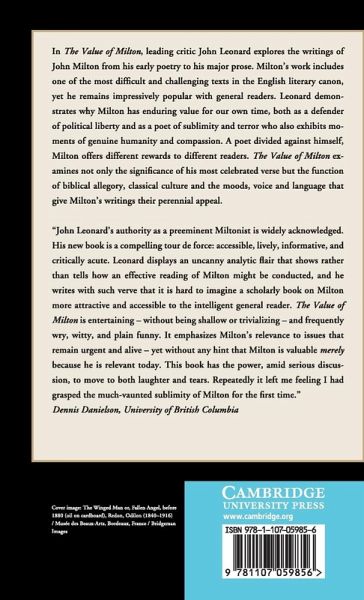 In The Value of Milton, leading critic John Leonard explores the writings of John Milton from his early poetry to his major prose. Milton's work includes one of the most difficult and challenging texts in the English literary canon, yet he remains impressively popular with general readers. Leonard demonstrates why Milton has enduring value for our own time, both as a defender of political liberty and as a poet of sublimity and terror who also exhibits moments of genuine humanity and compassion. A poet divided against himself, Milton offers different rewards to different readers. The Value of Milton examines not only the significance of his most celebrated verse but also the function of biblical allegory, classical culture, and the moods, voice and language that give Milton's writings their perennial appeal.