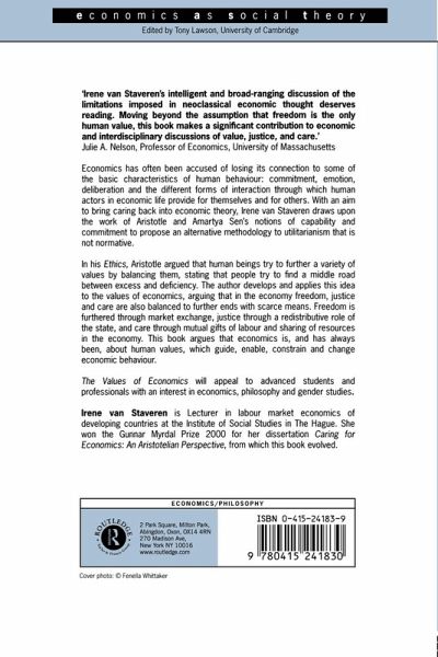 In his Ethics, Aristotle argued that human beings try to further a variety of values by balancing them, stating that people try to find a middle road between excess and deficiency. The author develops and applies this idea to the values of economics, arguing that in the economy; freedom, justice and care are also balanced to further ends with scarce means. Freedom is furthered through market exchange, justice through a redistributive role of the state, and care through mutual gifts of labour and sharing of resources in the economy. The book argues that economics is, and has always been, about human values, which guide, enable, constrain and change economic behaviour.