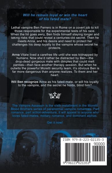 Will he remain loyal, or win the heart of his fated mate? Lethal vampire, Ben Ferrero, is in Rome on a covert job to kill those responsible for the experimental tests on his race. When the hit goes awry, Ben finds himself staying longer, taking risks that could reveal a centuries-old secret. Then he meets Anna, and his desire and need to protect her challenges his deep loyalty to the vampire whose secret he protects. Anna Vitale lived a carefree life until she was kidnapped by humans. Now she'd rather be distracted by Ben-the drop-dead gorgeous male with dimples that could melt panties-than face another therapy session. But when he outwits the powerful Moretti security team, it's obvious Ben is far more dangerous than anyone realizes. To them and her heart. Will Ben recognize Anna as his fated-mate, or will his loyalty to the vampire, and the secret he holds, blind him? The Vampire Assassin is the next installment in the Moretti Blood Brothers series of paranormal vampire romances. Part romance, part action-adventure, it will appeal to anyone who loves fated-mates, military romance, and dominant alphas.