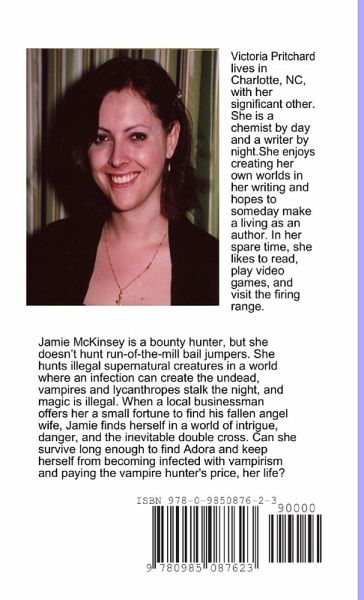 Jamie McKinsey is a bounty hunter, but she doesn't hunt run-of-the-mill bail jumpers. She hunts illegal supernatural creatures in a world where an infection can create the undead, vampires and lycanthropes stalk the night, and magic is illegal. When a local businessman waltzes in and offers her a small fortune to find his kidnapped fallen angel wife, Jamie finds herself in a world of intrigue, danger, and the inevitable double cross. Can she survive long enough to find Adora and keep herself from becoming infected with vampirism? Will she end up in the crosshairs of one of her fellow hunters and pay the vampire hunter's price, her life?