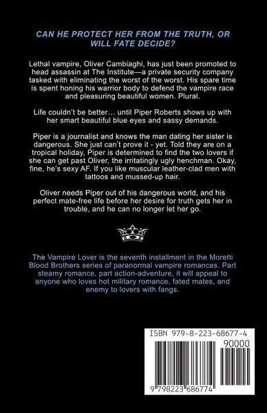 CAN HE PROTECT HER FROM THE TRUTH, OR WILL FATE DECIDE? Lethal vampire, Oliver Cambiaghi, has just been promoted to head assassin at The Institute – a private security company tasked with eliminating the worst of the worst. His spare time is spent honing his warrior body to defend the vampire race, and pleasuring beautiful women. Plural. Life couldn't be better… until Piper Roberts shows up with her smart beautiful blue eyes and sassy demands. Piper is a journalist and knows the man dating her sister is dangerous. She just can't prove it - yet. Told they are on a tropical holiday, Piper is determined to find the two lovers if she can get past Oliver, the irritatingly ugly henchman. Okay fine, he's sexy AF. If you like muscular leather-clad men with tattoos and mussed-up hair. Oliver needs Piper out of his dangerous world, and his perfect mate-free life before her desire for truth gets her in trouble, and he can no longer let her go. The Vampire Lover is the next installment in the Moretti Blood Brothers series of paranormal vampire romances. Part steamy romance, part action-adventure, it will appeal to anyone who loves hot military romance, fated mates, and enemy to lovers with fangs. Get it now! ¿¿¿¿¿¿¿¿¿¿ The Moretti Blood Brothers is the newest paranormal romance series to take the genre by storm. With hundreds of five-star reviews, these HOT and dangerous vampires have won hearts and taken the place of book boyfriends worldwide. ¿¿¿¿¿¿¿¿¿¿ What readers of the Moretti Blood Brothers are saying: "Wow absolutely amazing read, I'm loving the Moretti brothers, but Craig was great. Love his protective personality and Brianna was fab. The nice part about each read is all the characters are involved in each story, which come together. Great story and plot. Lots of love scenes, some fab banter, loads of angst, and some dark moments but an amazing love story. Highly recommend to supernatural fans" - Tina T ¿¿¿¿¿¿¿¿¿¿ "Once again Juliette N Banks blew me away with her writing. I loved the characters and all the emotions that Juliette could make me feel. The dynamics between Craig and Brianna is explosive. This book is not only steamy but heart-wrenching. It will suck you in and keep you captivated. You will not be disappointed in this book." – Tammy ¿¿¿¿¿¿¿¿¿¿ "What to say about the newest Moretti brother book!!!! OH MY!!! Very hot and steamy story with a great storyline!! The twists and turns in this book you will never see coming! Another great story by Juliette! I could not put this book down until I was done, and it has left me desperately wanting more." – Wcamaddox ¿¿¿¿¿¿¿¿¿¿