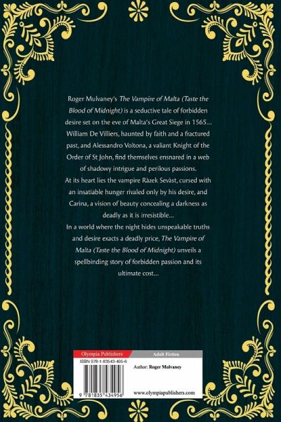 Roger Mulvaney's The Vampire of Malta (Taste the Blood of Midnight) is a seductive tale of forbidden desire set on the eve of Malta's Great Siege in 1565... William De Villiers, haunted by faith and a fractured past, and Alessandro Voltona, a valiant Knight of the Order of St John, find themselves ensnared in a web of shadowy intrigue and perilous passions. At its heart lies the vampire Ràzek Sevàst, cursed with an insatiable hunger rivaled only by his desire, and Carina, a vision of beauty concealing a darkness as deadly as it is irresistible... In a world where the night hides unspeakable truths and desire exacts a deadly price, The Vampire of Malta (Taste the Blood of Midnight) unveils a spellbinding story of forbidden passion and its ultimate cost...