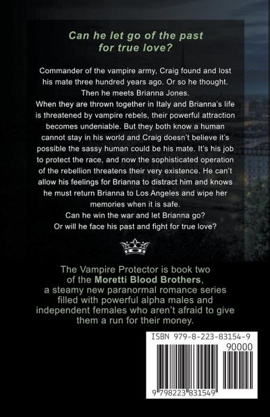 Can he let go of the past for true love? Commander of the vampire army, Craig found and lost his mate three hundred years ago. Or so he thought. Then he meets Brianna Jones. When they're thrown together in Italy and Brianna's life is threatened by vampire rebels, their powerful attraction becomes undeniable. But they both know a human cannot stay in his world and Craig doesn't believe it's possible the sassy human could be his mate. It's his job to protect the race, and now the sophisticated operation of the rebellion threatens their very existence. He can't allow his feelings for Brianna to distract him and knows he must return Brianna to Los Angeles and wipe her memories when it is safe. Can he win the war and let Brianna go? Or will he face his past and fight for true love? The Vampire Protector is the next installment, in the steamy new paranormal romance series the Moretti Blood Brothers. Part paranormal romance, part action-adventure, it will appeal to anyone who loves fated-mates, forced proximity and military romance with supernatural abilities. And happy ever after's.