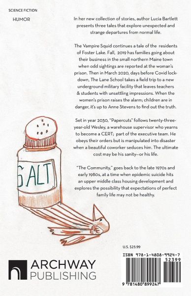 In her new collection of stories, author Lucia Bartlett presents three tales that explore unexpected and strange departures from normal life. The Vampire Squid continues a tale of the residents of Foster Lake. Fall, 2019 has families going about their business in the small northern Maine town when odd sightings are reported at the woman's prison. Then in March 2020, days before Covid lock-down, The Lane School takes a field trip to a new underground military facility that leaves teachers & students with unsettling impressions. When the women's prison raises the alarm; children are in danger, it's up to Anne Stevens to find out the truth. Set in year 2030, "Papercuts" follows twenty-three-year-old Wesley, a warehouse supervisor who yearns to become a CERT; part of the executive team. He obeys their orders but is manipulated into disaster when a beautiful coworker seduces him. The ultimate cost may be his sanity-or his life. "The Community," goes back to the late 1970s and early 1980s, at a time when epidemic suicide hits an upper middle class housing development and explores the possibility that expectations of perfect family life may not be healthy.