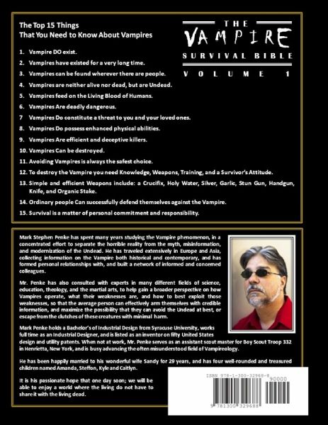 The Vampire Survival Bible, Identifying, Avoiding, Repelling and Destroying the Undead, Volume 1 is the authoritative book on separating the confusing and misleading Vampire myth from the shocking reality. Together Volumes 1 and 2 look at every aspect of the Undead, and teach you how to avoid contact with these murderous creatures, how to repel them if contact is unavoidable, and how to effectively destroy the Vampire, if your life is endangered. This book draws upon historical facts, little known case studies, suppressed information, and the expert opinions of professionals in many different fields of study. For the first time in human history, we now have a definitive 2 Volume set of books that cut through the myth, misinformation, and modernization of the Undead, equipping humanity with the vital information we need to take ourselves and our loved ones "off the menu" of the Blood-Sucking terror called the Vampire. With this knowledge, we are now in a position to take back the night from these monsters.