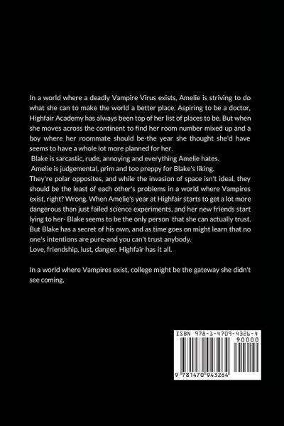 In a world where a deadly Vampire Virus exists, Amelie is striving to do what she can to make the world a better place. Aspiring to be a doctor, Highfair Academy has always been top of her list of places to be. But when she moves across the continent to find her room number mixed up and a boy where her roommate should be-the year she thought she'd have seems to have a whole lot more planned for her. Blake is sarcastic, rude, annoying and everything Amelie hates. Amelie is judgemental, prim and too preppy for Blake's liking. They're polar opposites, and while the invasion of space isn't ideal, they should be the least of each other's problems in a world where Vampires exist, right? Wrong. When Amelie's year at Highfair starts to get a lot more dangerous than just failed science experiments, and her new friends start lying to her- Blake seems to be the only person that she can actually trust. But Blake has a secret of his own, and as time goes on might learn that no one's intentions are pure-and you can't trust anybody. Love, friendship, lust, danger. Highfair has it all. In a world where Vampires exist, college might be the gateway she didn't see coming.