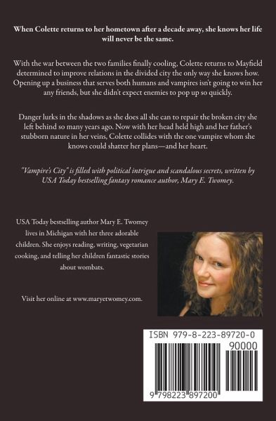 When Colette returns to her hometown after a decade away, she knows her life will never be the same. With the war between the two families finally cooling, Colette returns to Mayfield determined to improve relations in the divided city the only way she knows how. Opening up a business that serves both humans and vampires isn't going to win her any friends, but she didn't expect enemies to pop up so quickly. Danger lurks in the shadows as she does all she can to repair the broken city she left behind so many years ago. Now with her head held high and her father's stubborn nature in her veins, Colette collides with the one vampire whom she knows could shatter her plans—and her heart. "Vampire's City" is filled with political intrigue and scandalous secrets, written by USA Today bestselling fantasy romance author, Mary E. Twomey.