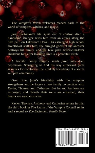 The Vampire's Witch welcomes readers back to the world of vampires, witches, and magic. Jaret Bachmann's life spins out of control after a handsome stranger saves him from an attack along the bike path on Lakeshore Drive. His estranged high school sweetheart stalks him, the enraged ghost of his ancestor destroys his family, and his bike path savior-cum-lover abandons him after learning Jaret is a powerful witch. A horrific family tragedy sends Jaret into deep depression. Struggling to find his way afterward, Jaret searches for comfort in the unlikely friendship of a secret vampire community. Over time, Jaret's friendship with the vampires strengthens and he forges a new family connection with Xavier, Thomas, and Catherine. But he and Anthony are estranged, and though their souls are entwined, their hearts are another matter. Xavier, Thomas, Anthony, and Catherine return in this, the third book in The Realm of the Vampire Council series and a sequel to The Bachmann Family Secret.