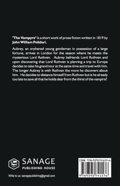 ""The Vampyre"" is a short work of prose fiction written in 1819 by John William Polidori. Aubrey, an orphaned young gentleman in possession of a large fortune, arrives in London for the season where he meets the mysterious Lord Ruthven. Aubrey befriends Lord Ruthven and upon discovering that Lord Ruthven is planning a trip to Europe decides to take his grand tour at the same time and travel with him. The longer Aubrey is with Ruthven the more he discovers about him. He decides to distance himself from Ruthven but is he already too late to save all that he holds dear from the thirst of the vampire?