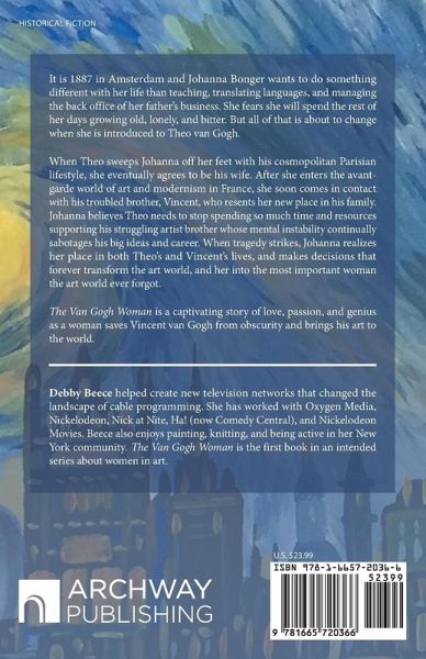 It is 1887 in Amsterdam and Johanna Bonger wants to do something different with her life than teaching, translating languages, and managing the back office of her father's business. She fears she will spend the rest of her days growing old, lonely, and bitter. But all of that is about to change when she is introduced to Theo van Gogh. When Theo sweeps Johanna off her feet with his cosmopolitan Parisian lifestyle, she eventually agrees to be his wife. After she enters the avant-garde world of art and modernism in France, she soon comes in contact with his troubled brother, Vincent, who resents her new place in his family. Johanna believes Theo needs to stop spending so much time and resources supporting his struggling artist brother whose mental instability continually sabotages his big ideas and career. When tragedy strikes, Johanna realizes her place in both Theo's and Vincent's lives, and makes decisions that forever transform the art world, and her into the most important woman the art world ever forgot. The Van Gogh Woman is a captivating story of love, passion, and genius as a woman saves Vincent van Gogh from obscurity and brings his art to the world.