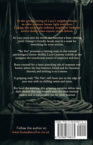 Set in Hastings in the UK. In the serene setting of Lucy's neighbourhood, an eerie presence looms right next door. George, the seemingly ordinary neighbour harbours secrets darker than anyone could fathom. As Lucy peers into his world, she uncovers a bone-chilling truth: George's friendly facade may be a mask for something far more sinister. "The Van" promises a riveting read; in this twisted psychological horror thriller, Lucy's journey unfolds as she navigates the treacherous waters of suspicion and fear. Brace yourself for a heart-pounding tale of suspense and horror, where the line between…mehr