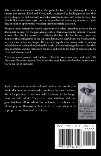 When two dominant souls collide, the sparks fly, but the real challenge lies in the embers that remain. Devil and Vixen, both accustomed to holding power over their lovers, struggle to find mutually-accessible territory to face each other as more than friends. But when Vixen negotiates a straw-purchase of a stunning submissive couple, they uncover an opportunity to explore their undeniable attraction. The plan seems perfect: the couple, eager to please, offers themselves as vessels for the dominants' desires. Yet, the game changes when Devil discovers the submissive woman is none other than his co-worker, a revelation that blurs the lines between power and intimacy. The conflagration of the tag-team domination overwhelms the friends, unable to resist their desires any longer. They sizzle as equals when Vixen finds the courage to lead them away from the comfortable world of power-exchange dynamics. But their time is limited, and the submissive couple is addicted to the kind of control only the Devil and Vixen can wield. A tale of power, passion, and the blurred lines between dominance and desire, The Vancouver Venture is a story of two lovers who must decide whether their connection is worth the risk of surrender.
