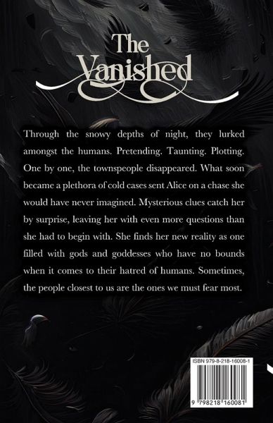 Through the snowy depths of night, they lurked amongst the humans. Pretending. Taunting. Plotting. One by one, the townspeople disappeared. What soon became a plethora of cold cases sent Alice on a chase she would have never imagined. Mysterious clues catch her by surprise, leaving her with even more questions than she had to begin with. She finds her new reality as one filled with gods and goddesses who have no bounds when it comes to their hatred of humans. Sometimes, the people closest to us are the ones we must fear most.