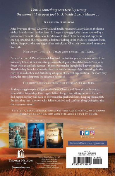 A story of second chances and secrets, this mysterious Regency romance will transport you to nineteenth-century England where a young lady reunites with her childhood love to find his missing sister. Her friend is missing. After five years abroad, Charity Halliwell returns to Loxby Manor, the home of dear friends--and her lost love. No longer a young girl, she is now haunted by a painful secret and the demise of her dreams. She hopes to find a place of healing and happiness, but instead she encounters a darkness lurking in the shadows of the once-familiar house. Then her friend, Seline, disappears the very night of her arrival, and Charity is determined to uncover the truth. Her only hope is the man who broke her heart. Branded a coward, Piers Cavanaugh has lived the last five years as an outcast far from his family home. When his sister presumably elopes with a stable hand, Piers joins forces with an unlikely partner--the one woman he thought he'd never see again. Together they launch an investigation that leads to strange nightly meetings in the ruins of an old abbey and disturbing whispers of a secret organization. The more they learn, the more desperate the situation becomes. The house seems determined to keep its secrets. As they struggle to piece together the clues, Charity and Piers also endeavor to rebuild their friendship. One cryptic letter changed everything between them. To find happiness they must overcome the grief and shame keeping them apart. But first they must discover why Seline vanished and confront the growing fear that she may never return. Settle in, because once you start The Vanishing at Loxby Manor, you won't be able to put it down.
