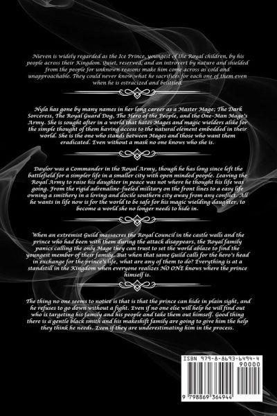 Nieven is widely regarded as the Ice Prince, youngest of the Royal children, by his people across their Kingdom. Quiet, reserved, and an introvert by nature and shielded from the people for unknown reasons make him come across as cold and unapproachable. They could never know what he sacrifices for each one of them even when he is ostracized and belittled. Nyla has gone by many names in her long career as a Master Mage; The Dark Sorceress, The Royal Guard Dog, The Hero of the People, and the One-Man Mage's Army. She is sought after in a world that hates Mages and magic wielders alike for the simple thought of them having access to the natural element embedded in their world. She is the one who stands between Mages and those who want them eradicated. Even without a mask no one knows who she is. Daylor was a Commander in the Royal Army, though he has long since left the battlefield for a simpler life in a smaller city with open minded people. Leaving the Royal Army to raise his daughter in peace was not where he thought his life was going. From the rigid adrenaline-fueled military on the front lines to a easy life owning a smithery in a loving and docile southern city away from any conflict. All he wants in life now is for the world to be safe for his magic wielding daughter, to become a world she no longer needs to hide in. When an extremist Guild massacres the Royal Council in the castle walls and the prince who had been with them during the attack disappears, the Royal family panics calling the only Mage they can trust to set the world ablaze to find the youngest member of their family. But when that same Guild calls for the hero's head in exchange for the prince's life, what are any of them to do? Everything is at a standstill in the Kingdom when everyone realizes NO ONE knows where the prince himself is. The thing no one seems to notice is that is that the prince can hide in plain sight, and he refuses to go down without a fight. Even if no one else will help he will find out who is targeting his family and his people and take them out himself. Good thing there is a gentle blacksmith and his makeshift family are going to give him the help they think he needs. Even if they are underestimating him in the process.