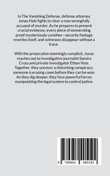 In The Vanishing Defense, defense attorney Jonas Hale is thrust into the battle of his career when he's tasked with defending Damien Thorpe, a man wrongfully accused of murder. The evidence against Damien is overwhelming, yet he insists on his innocence. As Jonas dives deeper into the case, he discovers something far more sinister at play-every shred of exonerating evidence begins to disappear. With security footage rewriting itself and crucial witnesses vanishing, Jonas realizes that someone is systematically erasing the truth. As the case unravels, he contacts investigative journalist Samira Cross and private investigator Ethan Voss, who have uncovered similar disappearances tied to a shadowy organization known as The Revisionists. Together, they uncover a chilling conspiracy: The Revisionists are using their power to manipulate legal systems and rewrite history itself, erasing cases before they can be won. With time running out and his own career at stake, Jonas must fight not only for his client's freedom but for the very concept of justice. The truth is slipping through his fingers, and the question remains-will anyone remember it once it's gone? This high-stakes thriller will have you on the edge of your seat, questioning reality as Jonas, Samira, and Ethan race against time to stop an invisible enemy. The Vanishing Defense is a gripping tale of corruption, power, and the price of truth. Buy this book now and dive into the twisted world of The Vanishing Defense.