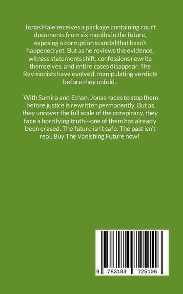 Jonas Hale thought he had seen the worst of The Revisionists' manipulations-until the impossible landed on his desk. A package with sealed court documents, detailing a case that hasn't happened yet. The evidence inside reveals a scandal set to unfold six months in the future-one that could take down powerful corporate and judicial elites. But as Jonas studies the files, they start changing before his eyes. Witnesses vanish. Confessions rewrite themselves. Reality is shifting in real-time. Someone isn't just erasing the past anymore-they are rewriting the future. Desperate for answers, Jonas calls on Samira Cross and Ethan Voss to help unravel the conspiracy before history is rewritten permanently. As they dig deeper, they uncover a chilling new truth: The Revisionists' power has evolved. They no longer just control justice. They decide fate itself. But when Jonas realizes one of them has already been erased, the battle for justice turns into a fight for survival. If they don't stop the Revisionists now, they may never have existed at all. Justice isn't blind anymore-it's being rewritten. A relentless thriller packed with twists, betrayals, and a terrifying glimpse into a world where the future is no longer certain. Buy The Vanishing Future now and uncover the truth before it disappears forever.