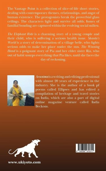 The Vantage Point is a collection of slice-of-life short stories, dealing with contemporary themes, relationships, and angst of human existence. The protagonists break the proverbial glass ceilings. The characters fight and survive all odds. Issues of familial bonding are captured within the evolving social milieu. The Elephant Ride is a charming story of a young couple and their child, who is suffering a serious health issue. Shanta's World is a story of determination of a village belle, who fights serious odds to make her place under the sun. The Winning Hand is a poignant story of Pia and her elder sister Ria, who out of habit usurps everything that Pia likes, until she faces the day of reckoning.