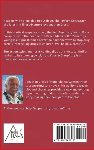 Readers will not be able to put down The Vatican Conspiracy, the latest thrilling adventure by Jonathan Cross. In this mystical suspense novel, the first American/Jewish Pope conspires with the head of the Italian Mafia, a U.S Senator, a young Jesuit priest, and a covert military operative to stop drug cartels from selling drugs to children. Will he be successful? The action twists and turns continually as this mystical thriller rushes to its stunning conclusion. The Vatican Conspiracy is a must-read for suspense fans.