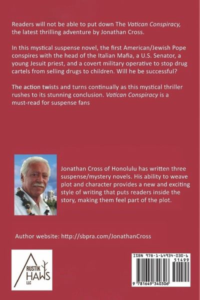 Readers will not be able to put down The Vatican Conspiracy, the latest thrilling adventure by Jonathan Cross. In this mystical suspense novel, the first American/Jewish Pope conspires with the head of the Italian Mafia, a U.S Senator, a young Jesuit priest, and a covert military operative to stop drug cartels from selling drugs to children. Will he be successful? The action twists and turns continually as this mystical thriller rushes to its stunning conclusion. The Vatican Conspiracy is a must-read for suspense fans.