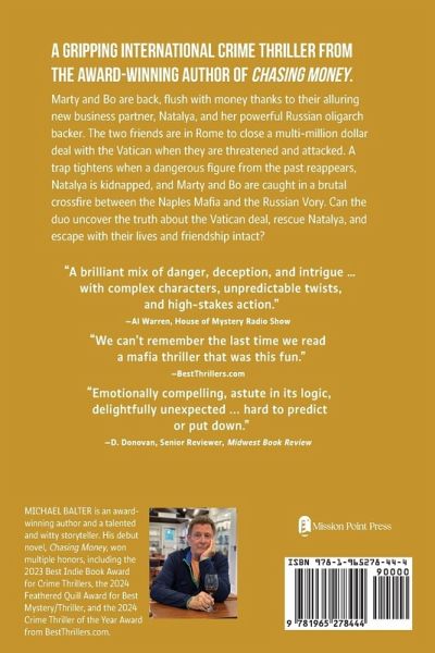 Danger, deception, and betrayal lurk at every turn in this compelling international crime thriller from the award-winning author of Chasing Money. Marty and Bo are back and flush with money thanks to their alluring new business partner, Natalya, and her powerful Russian oligarch backer. The two friends are in Italy to buy an art foundry and close a multi-million dollar licensing deal with the Vatican. But when they arrive, they discover the stakes are far higher than they imagined. Threatened and attacked, Marty and Bo find themselves caught in a trap. The Naples Mafia is after the foundry for nefarious purposes. The head of the Vatican Bank has a hidden agenda. The Russian oligarch wants more than he is saying. Everyone is keeping secrets and telling lies. The two friends are ready to call it quits when a dangerous figure from their past appears in Rome. And then Natalya is kidnapped, the stakes go from business to personal, and all bets are off. Caught in the crossfire between the Naples Mafia and the Russian Vory, can Marty and Bo uncover the truth about the Vatican deal, find a way to rescue Natalya, and escape with their lives and friendship intact?