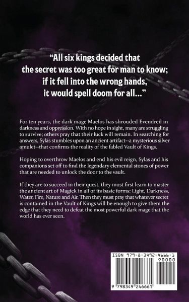 For ten years, the dark mage Maelos has shrouded Evendreil in darkness and oppression. With no hope in sight, many are struggling to survive; others pray that their luck will remain. In searching for answers, Sylas stumbles upon an ancient artifact--a mysterious silver amulet--that confirms the reality of the fabled Vault of Kings. Hoping to overthrow Maelos and end his evil reign, Sylas and his companions set off to find the legendary elemental stones of power that are needed to unlock the door to the vault. If they are to succeed in their quest, they must first learn to master the ancient art of Magick in all of its basic forms: Light, Darkness, Water, Fire, Nature, and Air. Then they must pray that whatever secret is contained in the Vault of Kings will be enough to give them the edge that they need to defeat the most powerful dark mage that the world has ever seen.
