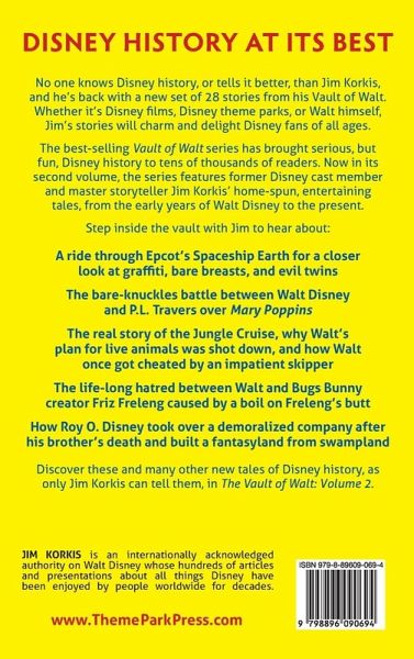 Disney History at Its Best No one knows Disney history, or tells it better, than Jim Korkis, and he's back with a new set of 28 stories from his Vault of Walt. Whether it's Disney films, Disney theme parks, or Walt himself, Jim's stories will charm and delight Disney fans of all ages. The best-selling Vault of Walt series has brought serious, but fun, Disney history to tens of thousands of readers. Now in its second volume, the series features former Disney cast member and master storyteller Jim Korkis' home-spun, entertaining tales, from the early years of Walt Disney to the present. Step inside the vault with Jim to hear about: A ride through Epcot's Spaceship Earth for a closer look at graffiti, bare breasts, and evil twins The bare-knuckles battle between Walt Disney and P.L. Travers over Mary Poppins The real story of the Jungle Cruise, why Walt's plan for live animals was shot down, and how Walt once got cheated by an impatient skipper The life-long hatred between Walt and Bugs Bunny creator Friz Freleng caused by a boil on Freleng's butt How Roy O. Disney took over a demoralized company after his brother's death and built a fantasyland from swampland Discover these and many other new tales of Disney history, as only Jim Korkis can tell them, in The Vault of Walt: Volume 2. Then be sure to check ALL the volumes in The Vault of Walt!