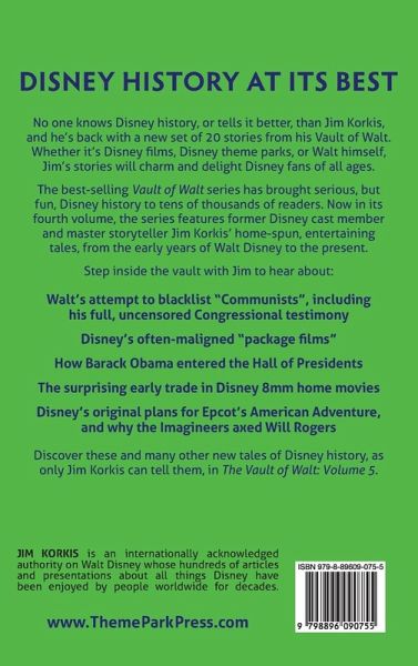 Disney History at Its Best No one knows Disney history, or tells it better, than Jim Korkis, and he's back with a new set of 20 stories from his Vault of Walt. Whether it's Disney films, Disney theme parks, or Walt himself, Jim's stories will charm and delight Disney fans of all ages. The best-selling Vault of Walt series has brought serious, but fun, Disney history to tens of thousands of readers. Now in its fifth volume, the series features former Disney cast member and master storyteller Jim Korkis' home-spun, entertaining tales, from the early years of Walt Disney to the present. Step inside the vault with Jim to hear about: Walt's attempt to blacklist "Communists", including his full, uncensored Congressional testimony Disney's often-maligned "package films" How Barack Obama entered the Hall of Presidents The surprising early trade in Disney 8mm home movies Disney's original plans for Epcot's American Adventure, and why the Imagineers axed Will Rogers Discover these and many other new tales of Disney history, as only Jim Korkis can tell them, in The Vault of Walt: Volume 5. Then be sure to check out ALL the volumes in THE VAULT OF WALT!