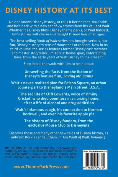 Disney History at Its Best No one knows Disney history, or tells it better, than Jim Korkis, and he's back with a new set of 24 stories from his Vault of Walt. Whether it's Disney films, Disney theme parks, or Walt himself, Jim's stories will charm and delight Disney fans of all ages. The best-selling Vault of Walt series has brought serious, but fun, Disney history to tens of thousands of readers. Now in its third volume, the series features former Disney cast member and master storyteller Jim Korkis' home-spun, entertaining tales, from the early years of Walt Disney to the present. Step inside the vault with Jim to hear about: Unraveling the facts from the fiction of Disney's feature film, Saving Mr. Banks Walt's never-realized plan for Edison Square, an urban counterpart to Disneyland's Main Street, U.S.A. The sad life of Cliff Edwards, voice of Jiminy Cricket, who died penniless in a nursing home, after a life of alcohol and drug addiction Walt's infamous cough, his connection to Norman Rockwell, and even his favorite apple pie The history of Disney fandom, from the exclusive Mouse Club to Disneyana Discover these and many other new tales of Disney history, as only Jim Korkis can tell them, in The Vault of Walt: Volume 3. Then be sure to check ALL the volumes in The Vault of Walt!