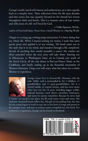 George's words, laced with humor and authenticity, are a time capsule back to a simpler time. These reflections from his life span decades and time zones, but stay squarely focused on the threads he's woven throughout: faith and family. This is a treasure trove of true stories and reflections of a life well lived for God. -Vikki Spencer, M.Ed., author of FearLessFridays: Notes from a Small Woman in a Big Big World. I began at a young age writing songs and poems; I've been doing that my whole life. When I started writing my stories, I took that same poetic prose and applied it to my writing. The book starts out in the vault that is in my mind, and wanders through a life completely devoid of anything that would resemble a career. My readers are often surprised where the next story will take them. Starting out in Minnesota, to Washington State, on to Canada just south of the Arctic Circle, all the way down to Port-au-Prince, Haiti, in the Caribbean, and finally ending up in the beautiful mountains of Western Montana. I hope you will enjoy what has taken me a whole lifetime to experience.