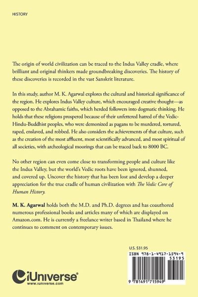 The origin of world civilization can be traced to the Indus Valley cradle, where brilliant and original thinkers made groundbreaking discoveries. The history of these discoveries is recorded in the vast Sanskrit literature. In this study, author M. K. Agarwal explores the cultural and historical significance of the region. He explores Indus Valley culture, which encouraged creative thought-as opposed to the Abrahamic faiths, which herded followers into dogmatic thinking. He holds that these religions prospered because of their unfettered hatred of the Vedic-Hindu-Buddhist peoples, who were demonized as pagans to be murdered, tortured, raped, enslaved, and robbed. He also considers the achievements of that culture, such as the creation of the most affluent, most scientifically advanced, and most spiritual of all societies, with archeological moorings that can be traced back to 8000 BC. No other region can even come close to transforming people and culture like the Indus Valley, but the world's Vedic roots have been ignored, shunned, and covered up. Uncover the history that has been lost and develop a deeper appreciation for the true cradle of human civilization with The Vedic Core of Human History.