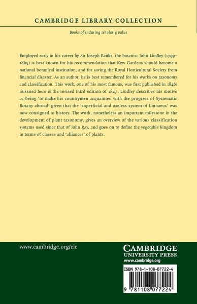 Employed early in his career by Sir Joseph Banks, the botanist John Lindley (1799-1865) is best known for his recommendation that Kew Gardens should become a national botanical institution, and for saving the Royal Horticultural Society from financial disaster. As an author, he is best remembered for his various works on taxonomy and classification. This work, one of his most famous, was first published in 1846; reissued here is the revised third edition of 1847. Lindley describes his motive as being 'to make his countrymen acquainted with the progress of Systematic Botany abroad' given that the 'superficial and useless system of Linnaeus' was now consigned to history. The work, nonetheless an important milestone in the development of plant taxonomy, gives an overview of the various classification systems used since that of John Ray, and goes on to define the vegetable kingdom in terms of classes and 'alliances' of plants.