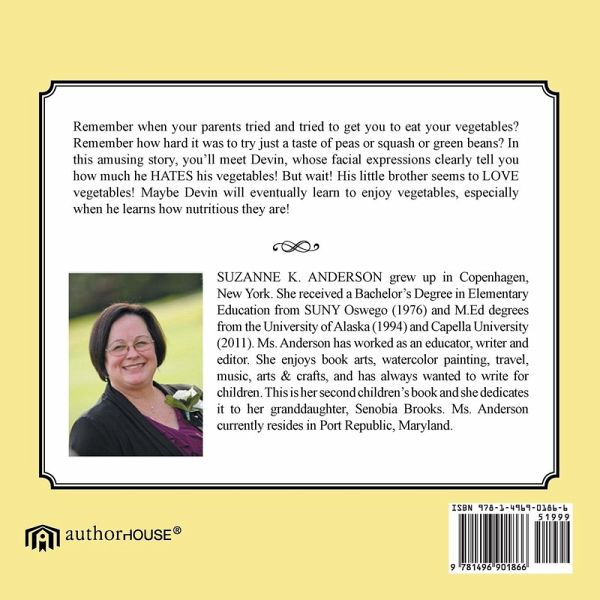 Remember when your parents tried and tried to get you to eat your vegetables? Yuck! Remember how hard it was to try just a taste of peas or squash or green beans? In this amusing story, you'll meet Devin, whose facial expressions clearly tell you how much he HATES his vegetables! But wait! His little brother seems to LOVE vegetables! Maybe Devin will eventually learn to enjoy vegetables, especially when he learns how nutritious they are!