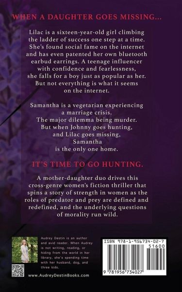 When a daughter goes missing... It's time to go hunting. Lilac is a sixteen-year-old girl climbing the ladder of success one step at a time. She's found social fame on the internet and has even patented her own bluetooth earbud earrings. A teenage influencer with confidence and fearlessness, she falls for a boy just as popular as her, but not everything is what it seems on the internet. Samantha is a vegetarian experiencing a marriage crisis. The major dilemma being murder, but when Johnny goes hunting and Lilac goes missing, Samantha is the only one home. A mother-daughter duo drives this cross-genre women's fiction thriller that spins a story of strength in women as the roles of predator and prey are defined and redefined, and the underlying questions of morality run wild.