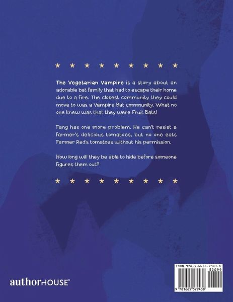 The Vegetarian Vampire is a story about an adorable bat family that had to escape their home due to a fire. The closest community they could move to was a Vampire Bat community. What no one knew was that they were Fruit Bats! Fang has one more problem. He can't resist a farmer's delicious tomatoes, but no one eats Farmer Red's tomatoes without his permission. How long will they be able to hide before someone figures them out?